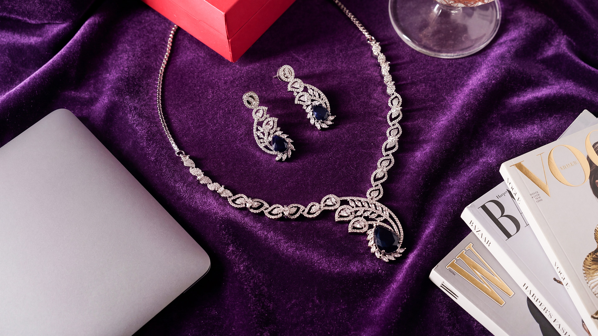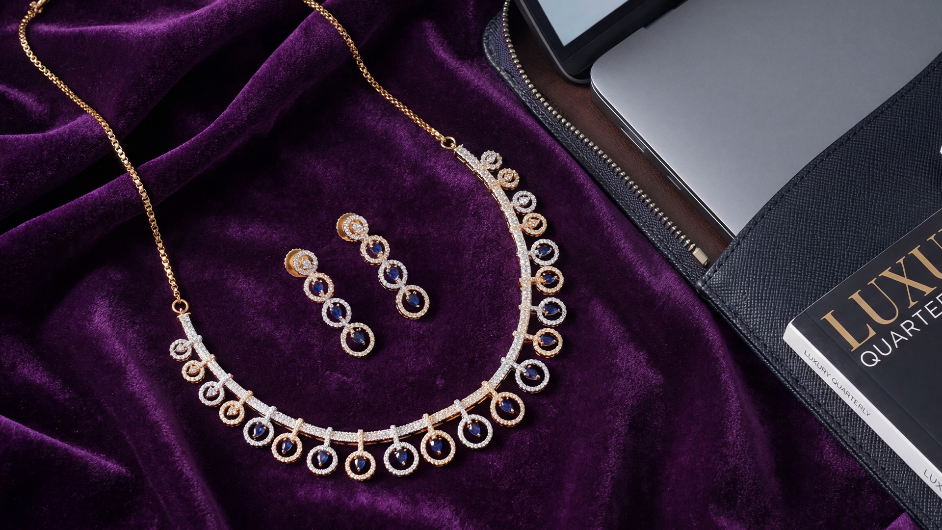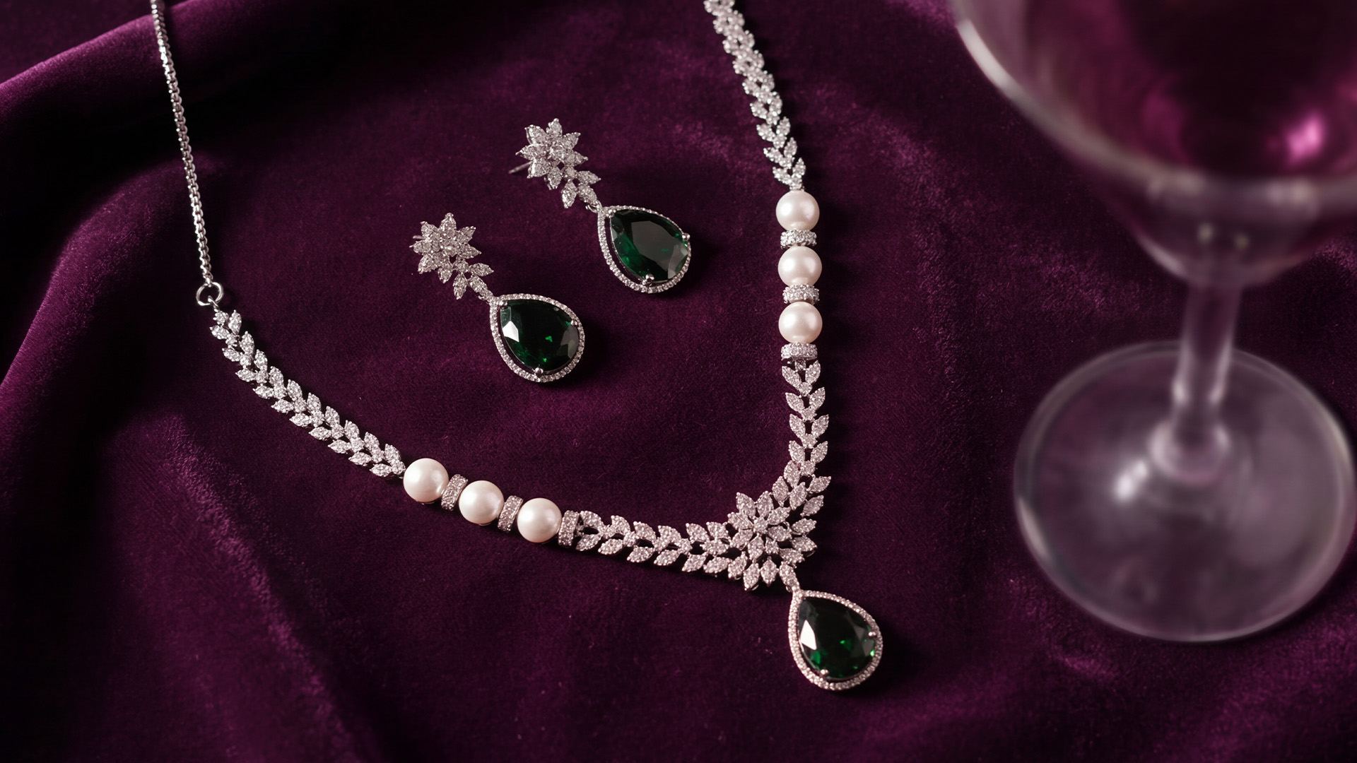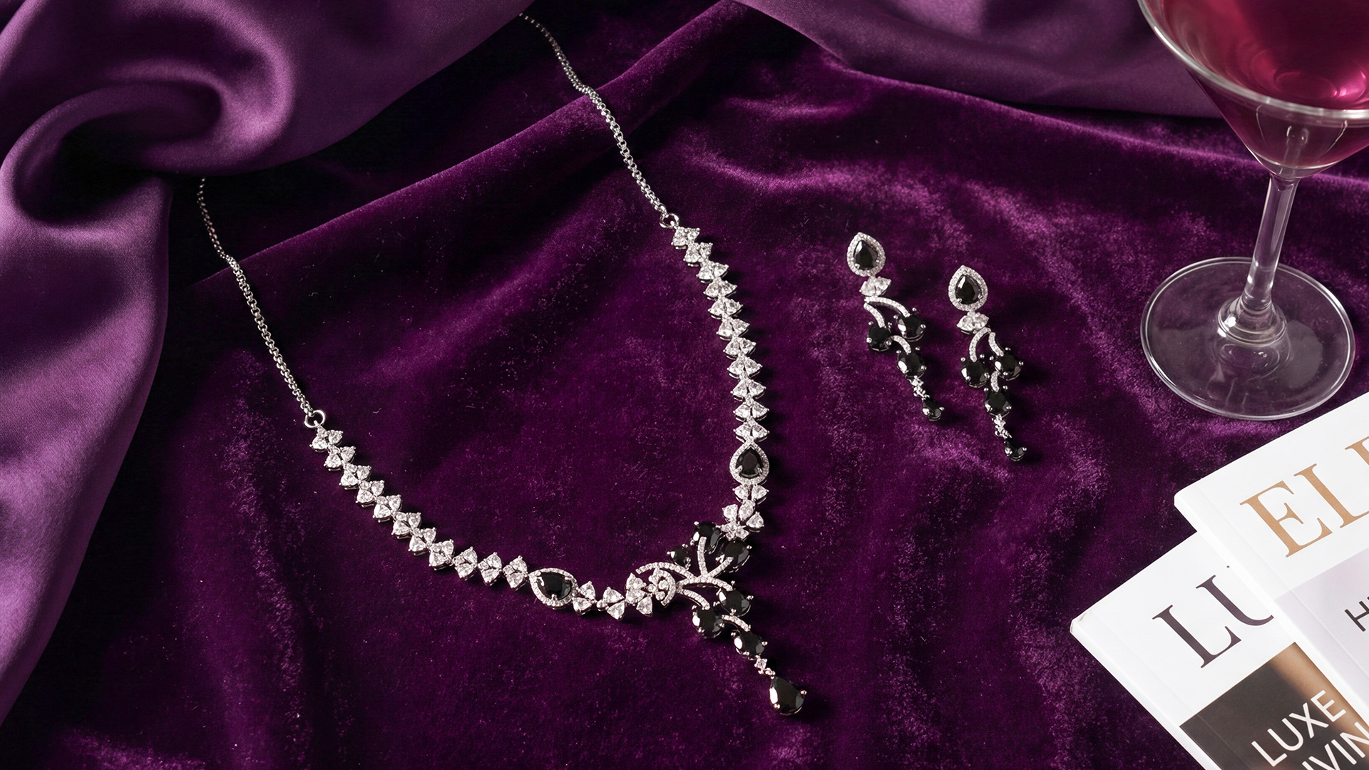 Embodying the beauty of the twilight hour, this necklace set is designed to complete your party look without looking overhyped. The array of American diamonds and stones in contrasting shades is perfect for a glamorous night out.