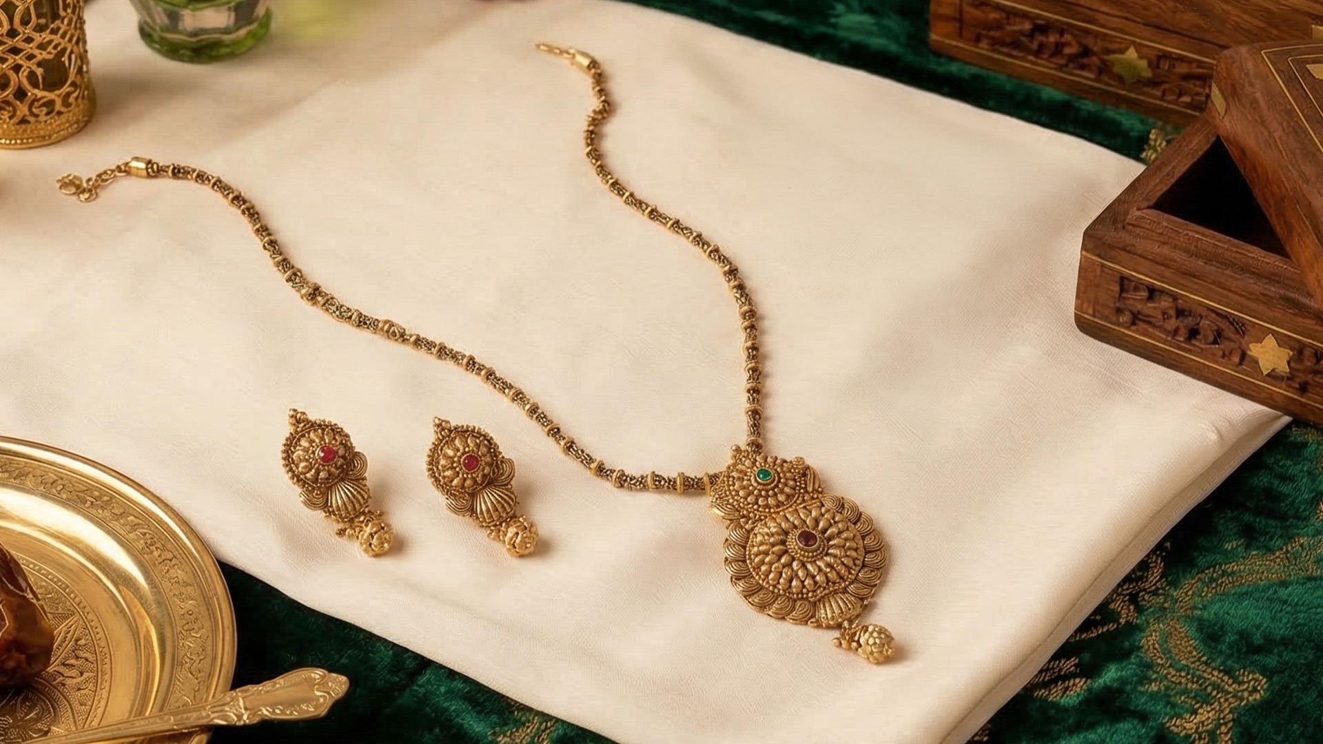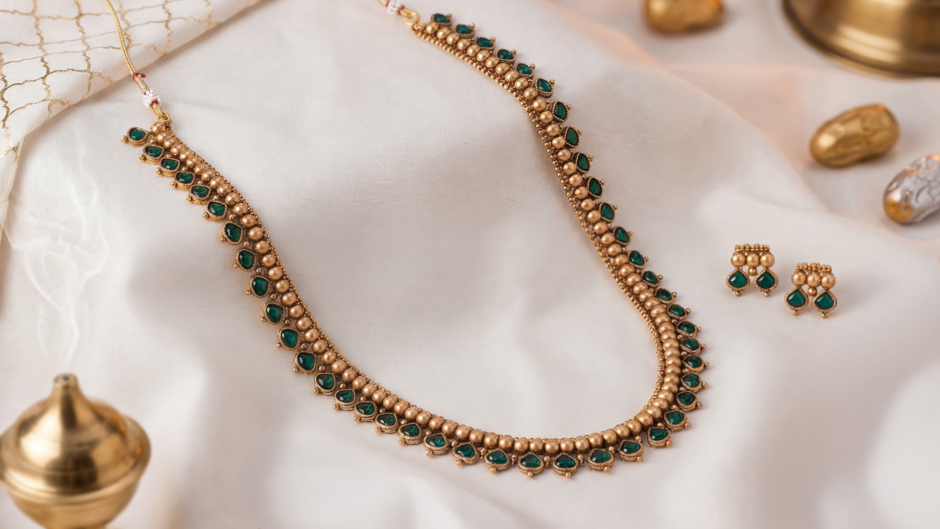 A sleek double-chain mangalsutra with a floral-inspired pendant and matching studs, easy to wear, hard to miss. Perfect for everyday charm or dressing up a simple saree.